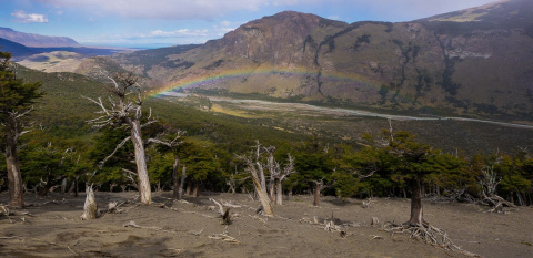 К этому моменту нам уже пришлось отказаться от одного дня, который мы оставили “на погоду”. Пришлось думать - мы можем выйти прямо сейчас и отказаться от Сьерро Торре или подождать еще один день, но тогда придется отказаться от похода на Лагуна Электрико. Решили стоять еще день. Было жалко резать маршрут, но получить фотографии неуловимой Сьерро Торре для меня было важнее. Этот день мы провели, гипнотизируя ветер, чтобы дул сильнее, и облака, чтобы открывались. Мы видели, как горы поседели от выпавшего на вершинах снега, видели и слышали, как сходят первые лавины. С надеждой мы всматривались в клубящиеся тучи, ожидая, что они вот-вот раскроются и мы увидим ЕЕ. Но видели только радугу. Этот мост леприконов мы успели возненавидеть, ведь радуга - это солнце и дождь. Постоянный дождь, капли которого в этих местах летят не вниз, а вбок.