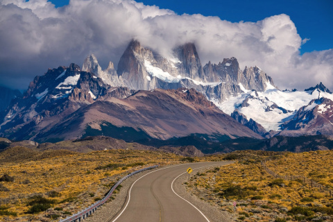Формат неплохой, но нам не подходит. Мы на следующее утро сели на автобус и отправились в поселок Эль-Чальтен. Ведет к поселку трасса Ruta 40, ровная как зеркало, то извивающаяся между холмами, как хлыст погонщика-гаучо, то стремящаяся прямой стрелой через пампасы. В конце пути дорога, изящно изогнувшись, выходит из-за невысокого гребня и устремляется вперед. Солнце осталось за спиной. Впереди в клубящихся темных тучах мы видим нашу цель - гору Фиц Рой.