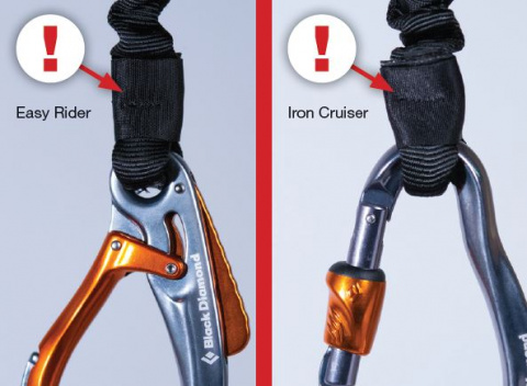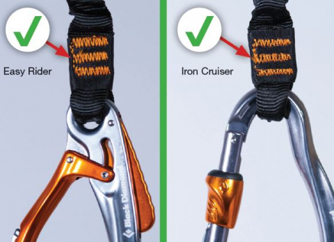 В случае, если Ваша самостраховка Виа Феррата соответствует критериям, перечисленным выше, проверьте места прикрепления карабинов к усам. Проверьте оба уса.