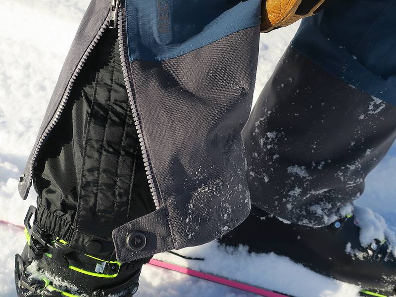 В брюках вшиты датчики Recco, впрочем, если вы катаетесь только в России, это не актуально. Зато было бы актуальным добавить петельку для пристёгивания лавинного датчика в одном из карманов. Карманов 5 штук, все вшитые, что позволяет носить бипер в них, а не в портупее. Это удобно, особенно когда на маршруте иногда нужно снять часть одежды. Все карманы оснащены водозащитными молниями, что намного удобнее, чем накладные планки. Кроме того, я заметил, что такие молнии сделаны более долговечными. Два уровня передних карманов удобны, чтобы распределить мелочи от бипера и платка до небольшого планшета и тонких перчаток. Задний карман я не использую, но он есть. Видимо, для заначки на такси после скитура. Еще есть утяжки-липучки на поясе, чтобы отрегулировать посадку по фигуре.