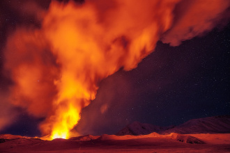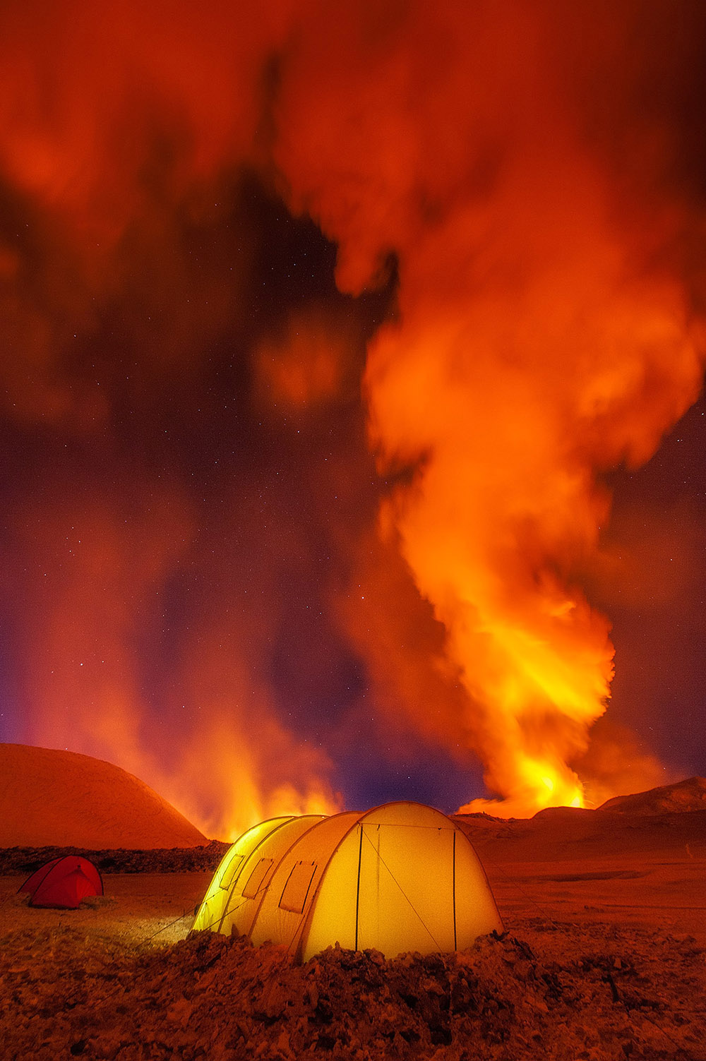 В это самое время Вероника, сидя в Москве, читала все, что только могла найти, об извержении Толбачика, ведь потоки лавы разрушили те места, по которым она совсем недавно бродила. И случайно наткнулась на фотографию: посреди черного от пепла снега стоит палатка, над которой возвышается столб алого пламени. “Кто этот псих, который там переночевал?”