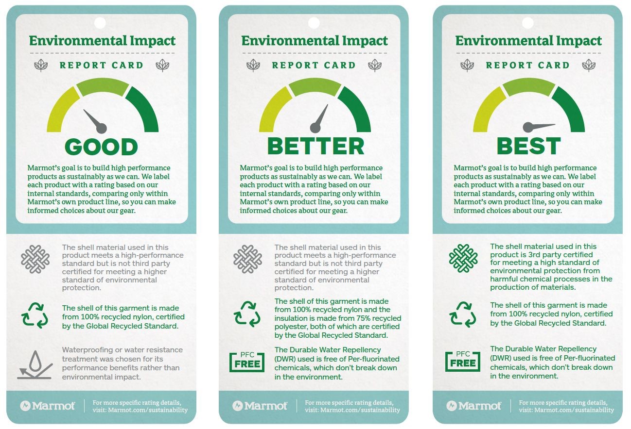 Чтобы понимать, насколько приобретаемый товар произведен с минимально негативным воздействием на окружающую среду Marmot разработал специальные этикетки, которые крепятся к изделию.