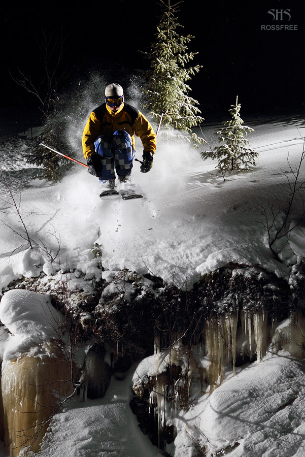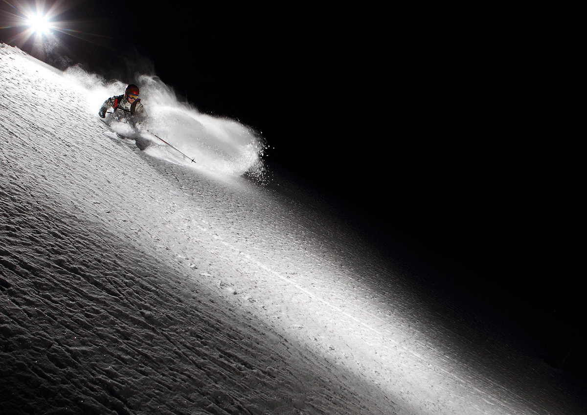 Вспышками можно «вырисовывать» райдера и снег в полной темноте. Но всё-таки для съемок лучше выбирать время сумерек. Настройками камеры можно «погасить» сумеречный свет, а вот ориентироваться и устанавливать оборудование в полной темноте не очень удобно. Это не говоря уже о райдере, получившему вспышку в лицо из темноты и приземлившемуся после дропа практически вслепую. Искусственный свет, как правило, имеет очень небольшую эффективную протяжённость и ширину луча. Другими словами, трюк должен попасть точно в пятно света. Для удобства ориентации при обсуждении того, кто и куда направляется, мы использовали простую лазерную указку, которой показывали на склоне место для подвига. Если всё рассчитать правильно, можно получить эффектный кадр с жёстким объёмным светом.