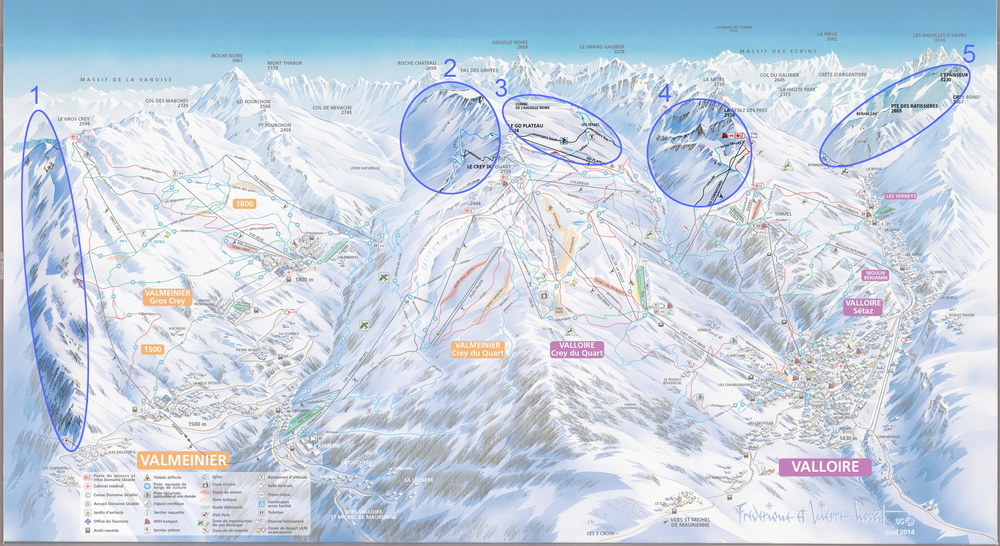 1. Верхняя часть состоит из гребней и кулуарчиков, а в средней много очаровательных елочек. Ведет сюда креселка Le Gros Crey, можно подняться за 3 минуты на вершину, и начать спуск оттуда, в зависимости от состояния снега. С вершины отличный вид на долину Морьен и массив Трех долин, видна канатка которая ведет туда из поселка Orelle. В нижней части много камешков и рельефа для прыжков. Выез жать можно прямо в Valmenier 1500, но если снега мало, то нужно уходить траверсом влево к верхней станции креселки Le Roi. От станции на 1500 м вдоль горы идет пешеходная тропа.