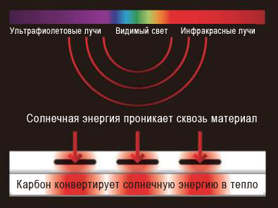 Основной особенностью активного сохранения тепла волокнами Heat Navi™ является их способность поглощать солнечный свет практически во всем спектре длин волн и превращать энергию света в тепло. Специально разработанные неорганические углеродные волокна вплетены в пересечения плоских волокон с большой площадью поверхности. Волокна Heat Navi™ эффективно повышают поглотительную способность материала и превращают энергию света в тепло.