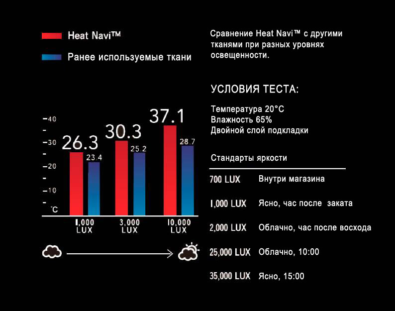 Солнечные лучи достигают поверхности Земли даже тогда, когда пасмурно и идет дождь. В этом случае количество тепла, генерируемого волокнами Heat Navi™, меньше, чем в ясный день, но эффективность этого процесса позволяет сохранять комфортные для человека условия.