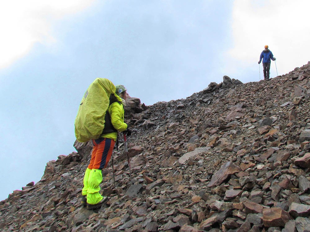 Привал заканчивается вместе в холодным ветром, сидеть холодно, и тучи могут вновь появиться. Идём к нужному склону по траве с вкраплениями камней. Иногда проявляем чудеса баланса, ставя ботинки на микроскопические уступы. Вскоре появляется "наша" седловина. Народ устремляется к ней, мы с завхозом отстаём, у обеих акклиматизация и усталость. Мужчины, добравшиеся до места, возвращаются за нами, помогают донести вещи.