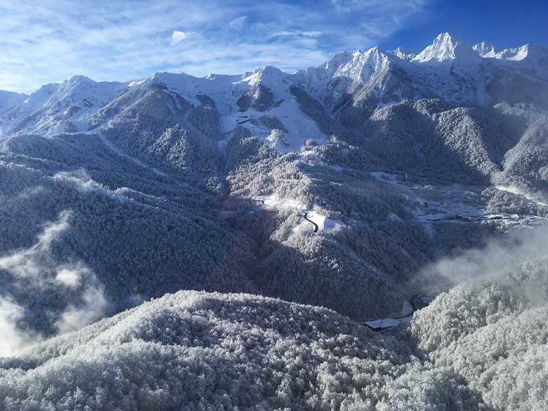 Высоты здесь примерно до 2000-2500 метров. Поэтому проблем с акклиматизацией, а тем более с горной болезнью, нет. Брэнд Красной Поляны - мощные снегопады и катание в глубоком снегу. Это то, что стоит попробовать, ожидая снегопада в Поляне или прилетая из Москвы на несколько дней под соответствующий прогноз. Здесь редко бывают сильные метели, поэтому снег часто лёгкий и пушистый, не уплотнённый ветром. Но тёплый климат быстро его портит, снег на солнце становится тёплым и мокрым, оседает и уплотняется. Кроме того, иногда так тепло, что дождь идёт не только внизу, но и на высоте трасс курорта. Впрочем, при правильном подходе, этот скоропортящийся продукт успешно раскатывают до истечения срока годности и ожидают следующей порции.