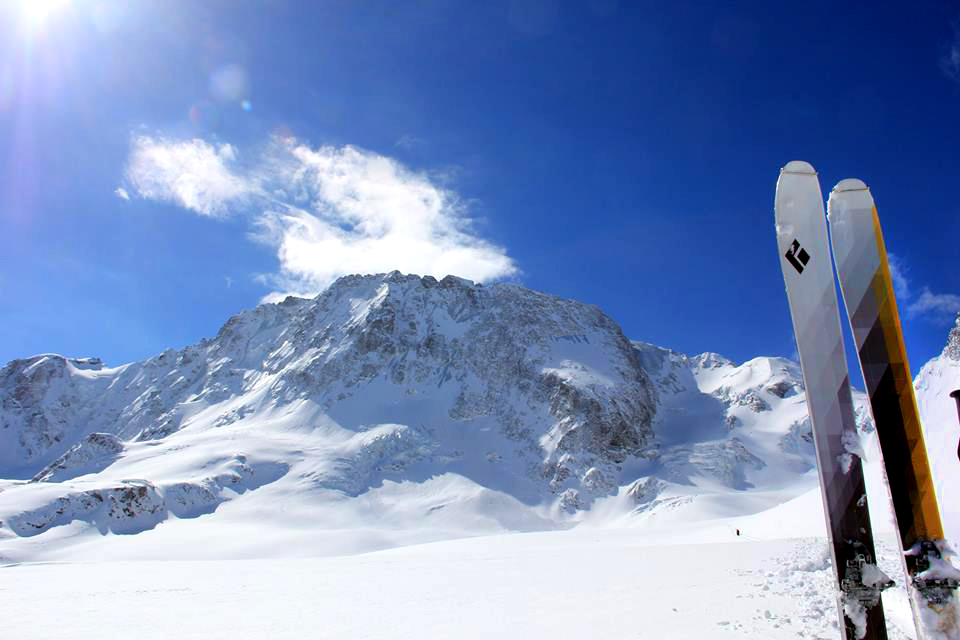 На подъемнике до станции Мир, оттуда на скитуре до верха гряды (4380 м) Набрали порядка 800 метров высоты. Вниз спустились по трассе, поскольку погода была не очень.
