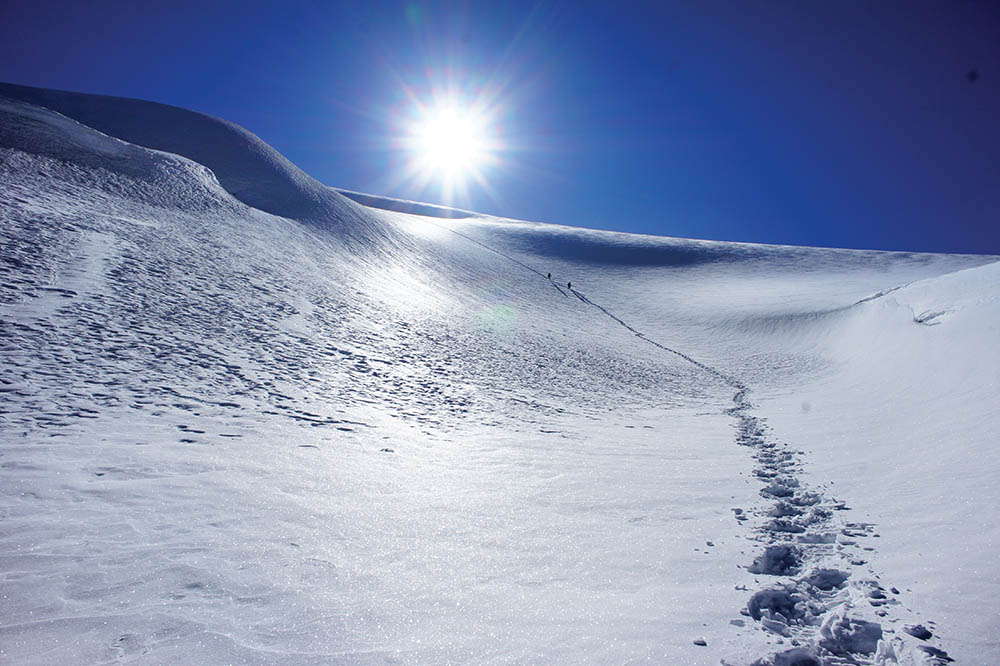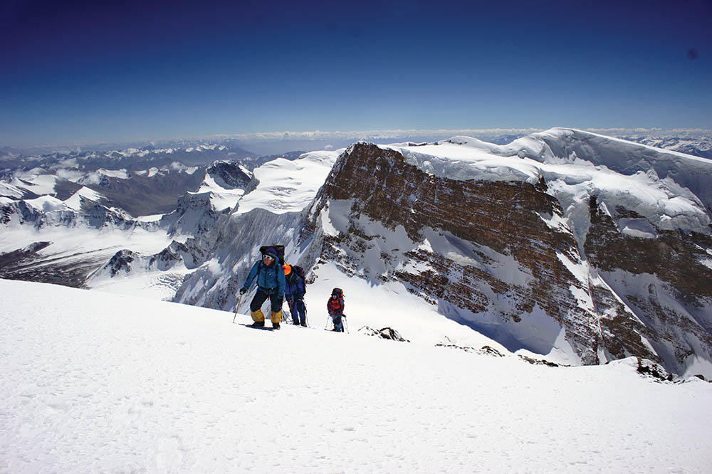 Поход завершился траверсом Музтаг-Аты с подъёмом по её редкопосещаемому южному гребню. Наш путь прошел не через высшую точку горы, а через седло (7215 м) между главной вершиной Музтаг-Аты и её южным плечом (7277 м). Вот именно к этому седлу подходит протяженный и острый южный гребень вершины, украшенный страшными карнизами, обрывающимися на восток в пропасть над ледником Коксель. На этом гребне у нас было две ночевки на высотах 6337 и 6860 м. А сразу за седлом на высоте 7200 м имеется небольшое плато, где мы переночевали, и с которого утром без рюкзаков сходили к туру на вершине Музтаг-Аты.