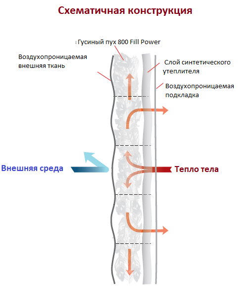 Для набивки используется высококачественный гусиный пух (800 Fill Power), подкладка из воздухопроницаемой ткани AirExchange. |