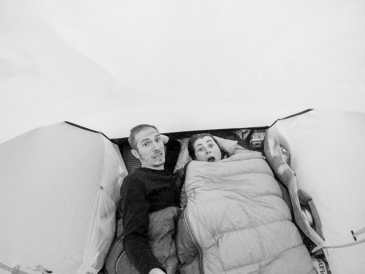Ставшие уже привычными удары дождя по палатке внезапно стали набирать силу, пока не стали совсем остервенелыми. Казалось, что ветер швыряет в наше укрытие уже не капли, а мелкие камушки. Когда палатка начала прогибаться настолько, что внутренний ее тент ложился нам на лица, мы поняли, что к нам пришли те самые сто километров в час ураганного ветра. Звук был такой, будто бы над нами проходили на бреющем полете реактивные истребители. Казалось, что сумасшедший ветер сейчас раскидает все камни с ветрозащитной юбки, повыдергивает колья и посрывает растяжки. А когда палатка внезпно озарилась идущим откуда-то снаружи желтым светом, мы решили, что теперь мы точно остались без внешнего полога. Оказалось, что шквальный ветер разорвал тучи и открыл полную луну. Всю ночь мы смотрели на мечущиеся по палатке в свете луны тени деревьев.