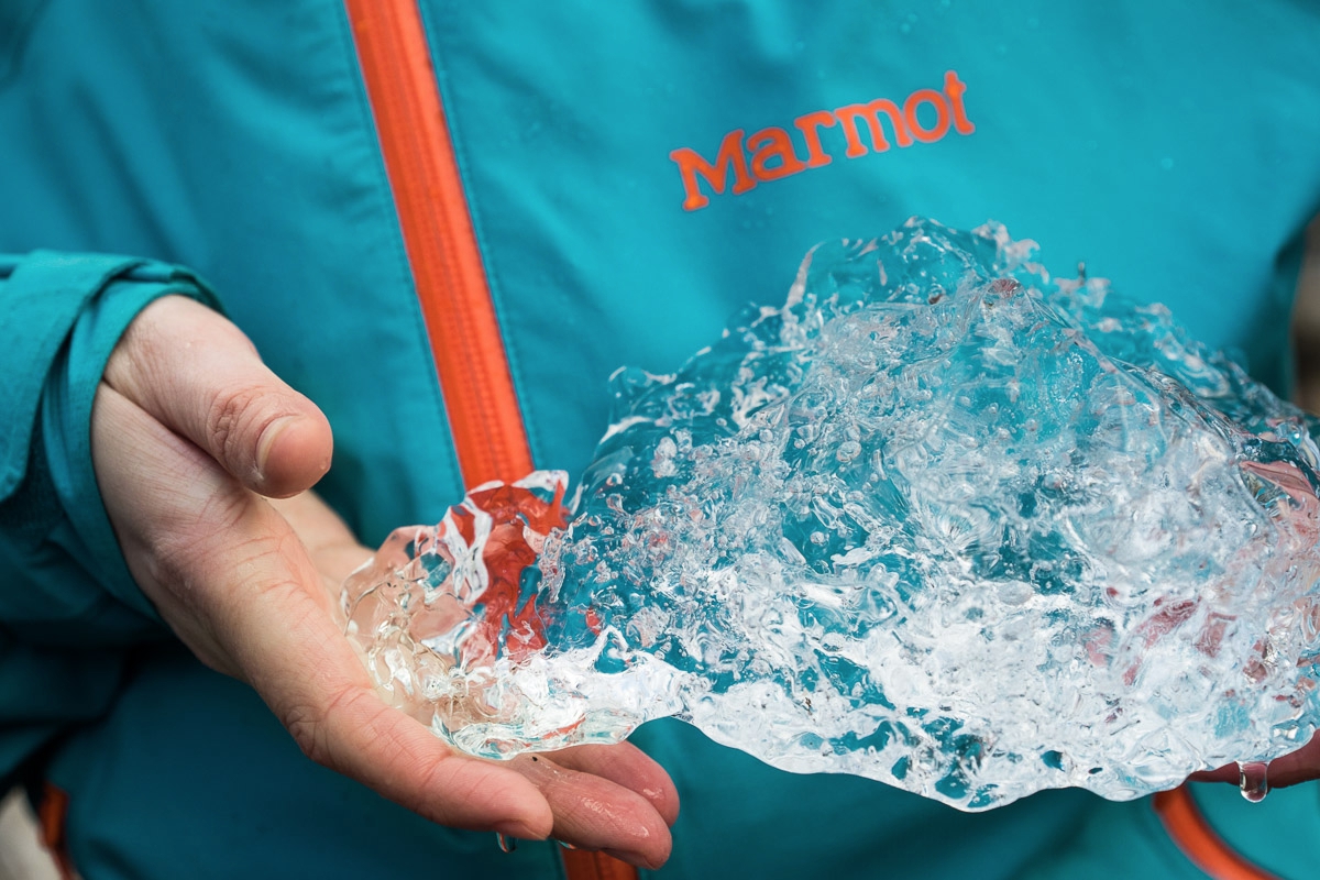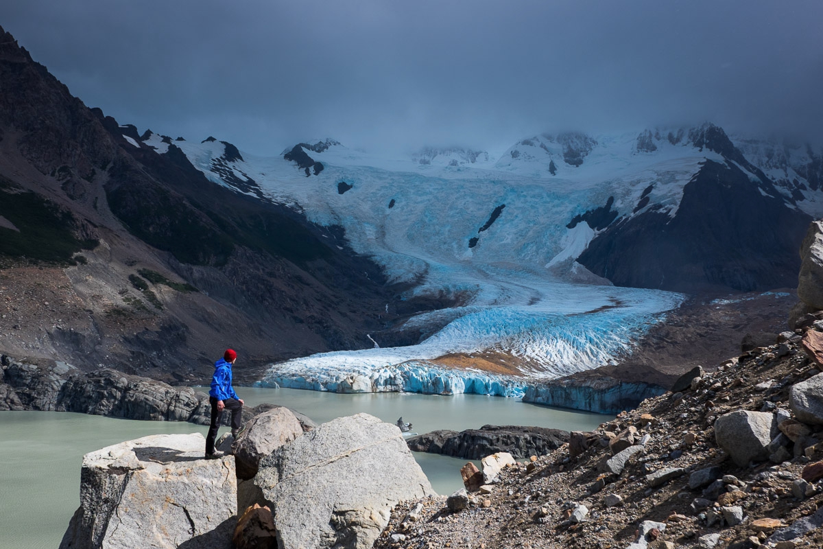 За первый день мы обошли озеро Лагуна Торре с севера, присмотрели несколько съемочных точек - с рекой на переднем плане, с деревом, с камушками, с озером. Солнце то появлялось, то исчезало, разрезая мрачный пейзаж яркими живыми пятнами, радугами, подсвечивая ледник и редкие айсберги на озере. В этот день мы познакомились с ветрами Патагонии - теми самыми, которые сбивают человека с ног. Это не шутка, не фигура речи - здесь на ветер можно ложиться. Здесь, если ты замешкался, тебя, даже отяжеленного рюкзаком, сбивает с ног и катит по склону. И, будто издеваясь над фотографом, ветер здесь всегда дует в объектив, так что схему “снять - протереть объектив - повторить двадцать раз, пока не получишь снимок без капель” мы оттренировали уже в первый день. И здесь же поняли всю прелесть экипировки, с которой нам помогли Marmot. Мембрана не защитила технику, но помогла нам сохранить тепло и не промокнуть - без этого снимать в таких условиях было бы совсем паршиво.