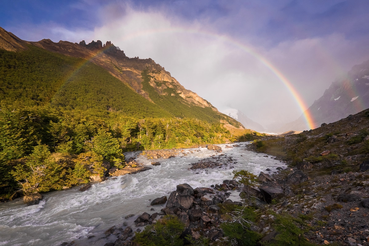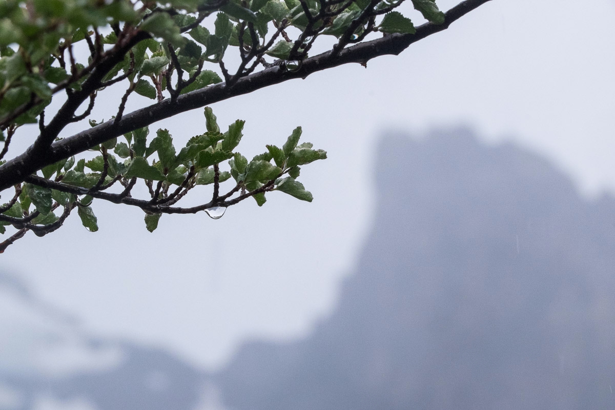 К этому моменту нам уже пришлось отказаться от одного дня, который мы оставили “на погоду”. Пришлось думать - мы можем выйти прямо сейчас и отказаться от Сьерро Торре или подождать еще один день, но тогда придется отказаться от похода на Лагуна Электрико. Решили стоять еще день. Было жалко резать маршрут, но получить фотографии неуловимой Сьерро Торре для меня было важнее. Этот день мы провели, гипнотизируя ветер, чтобы дул сильнее, и облака, чтобы открывались. Мы видели, как горы поседели от выпавшего на вершинах снега, видели и слышали, как сходят первые лавины. С надеждой мы всматривались в клубящиеся тучи, ожидая, что они вот-вот раскроются и мы увидим ЕЕ. Но видели только радугу. Этот мост леприконов мы успели возненавидеть, ведь радуга - это солнце и дождь. Постоянный дождь, капли которого в этих местах летят не вниз, а вбок.