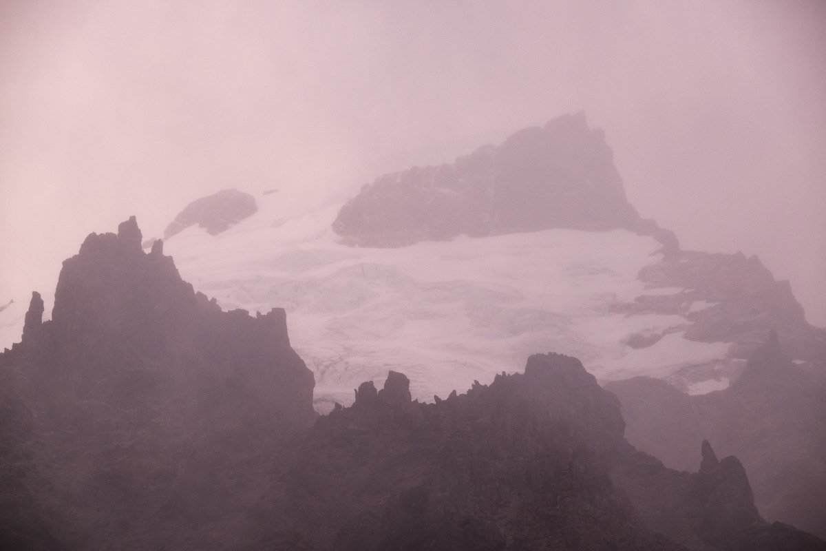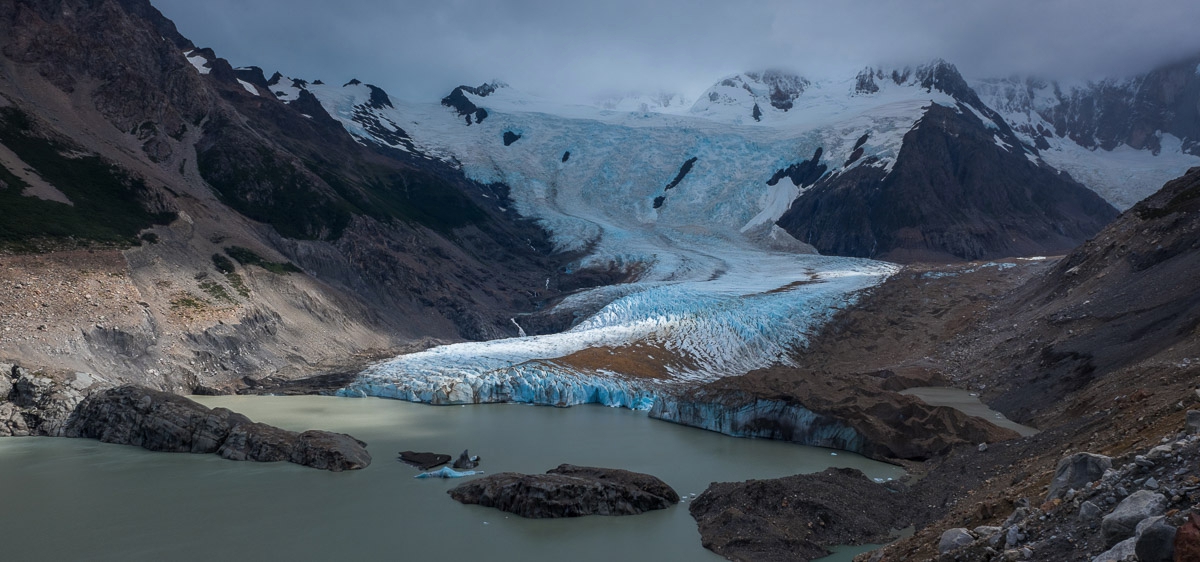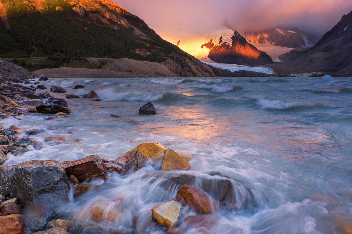 На следующий день рассвета не случилось. Равно как не случилось и появления Сьерра Торре. Нужно сразу сказать, что для аргентинской Патагонии рассвет - время ключевое. Высокие скалы-иглы не просто доминируют в ландшафте - их просто нечему заслонять, поэтому и Сьерра Торре, и Фиц Рой безраздельно получают первые, а также вторые и третьи солнечные лучи. И, в отличие от большинства случаев съемок в горах, солнечный свет довольно быстро доходит и до переднего плана - ледников, камней, редких, свернутых на сторону ураганными ветрами деревьев. И повернуты все горы так, что все самое красивое происходит именно на рассвете.