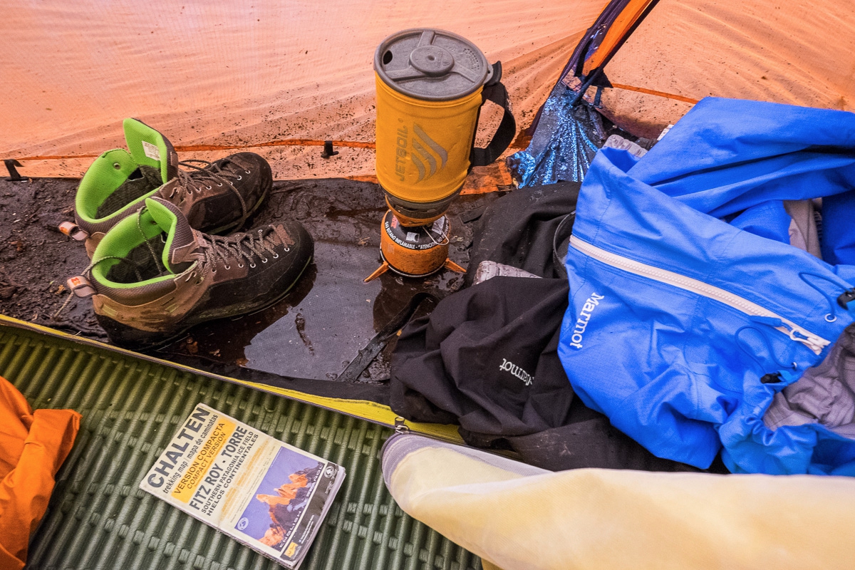 Он продолжался всю ночь и весь следующий день. Мы видели, как один за другим снимают свои микроскопические палатки альпинисты, как поднимается вода и лужи стоят даже на песке. К середине второго дня любая ямка превратилась в море, море проникало и внутрь тамбуров палатки, так что вокруг нее пришлось копать дренажные канавки. К ночи вода начала просачиваться сквозь полог палатки, текла ручьями по полу вдоль кариматов и заливала вещи, которые мы столь тщательно пытались сохранить сухими: пуховые спальники, хлеб, карту, технику. Вода была везде. Чтобы не сойти с ума от того, что весь день сидишь в тесном и замкнутом, холодном и сыром пространстве и уже вторую неделю не ешь нормальной еды, мы начали петь. Сначала тихонько, глядя в глаза друг другу, а потом уже смелее и громче. Назло дождю. Начали с “Ой, мороз-мороз” и закончили всем репертуаром “Ленинграда”. И если на Серро Торре Marmot защищал нас от шквального ветра, то здесь он помогал нам переждать и пережить бесконечный дождь.
