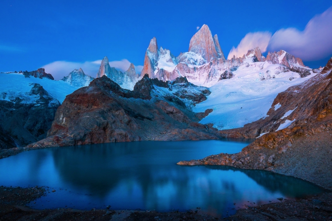 Но поздно ночью, даже не позавтракав и не выпив горячего чая, мы собрались и вышли на тропу. Чтобы поднявшись до озера Лагуна Де Лос Трес увидеть великолепный Фиц Рой! Со спины могучего исполина подсвечивала заходящая полная луна, спереди же на нем начали появляться первые багряные оттенки еще не взошедшего солнца. В те минуты мы были готовы простить Патагонии все - шквальный ветер, изнуряющий дождь, холод, коварство, необходимость тащить в горы технику.