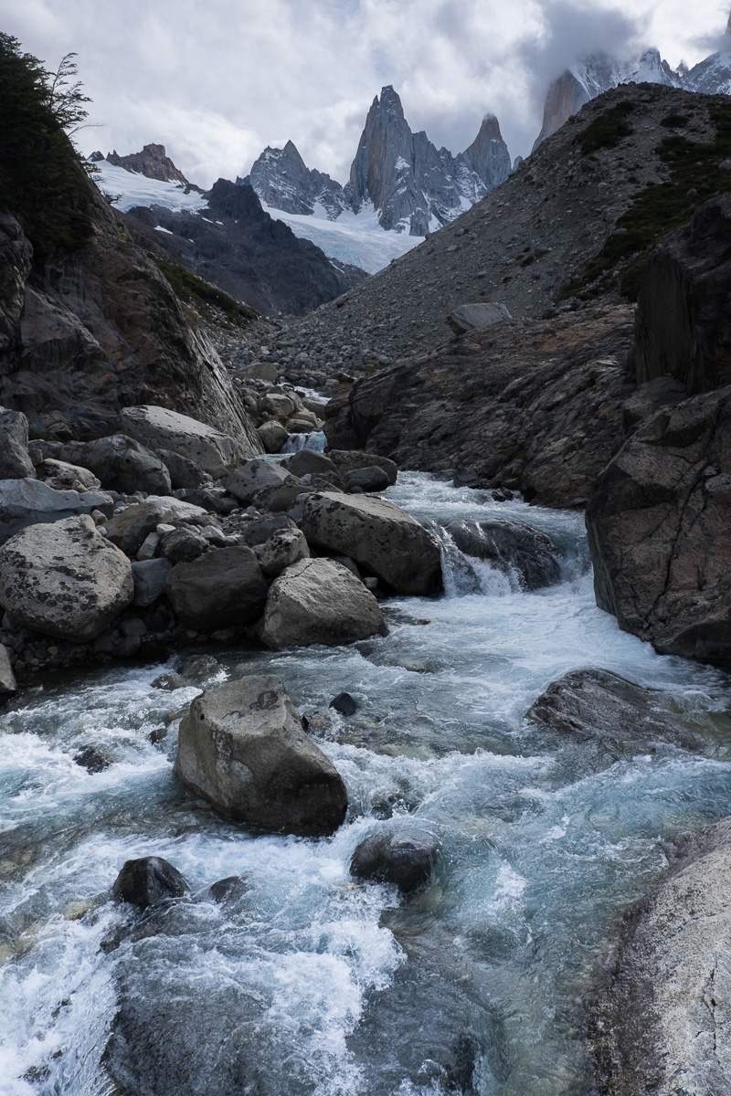 По сравнению с Фиц Роем съемки Сьерро Торре - сплошная халява. На нашей первой стоянке снимать можно было отойдя сотню-две метров от лагеря. Чтобы получить хороший вид на Фиц Рой приходится подниматься метров на 600 вверх по крутой тропе. В темноте. По мокрым камням и грязи, по руслу ручья. На это уходит не меньше двух часов. Удовольствие не из приятных и вверх тянет только та самая надежда увидеть и снять. Но в то утро мы явно надеялись больше, чем нужно. Еще до восхода чистое небо затянули тучи. Ровно в тот момент, когда мы дошли до конца тропы, небо заволокло совсем, и на нас обрушился плотный дождь с градом. Пришла снеговая туча и закрыла и солнце, и горы, и долину. Надежда тянула вперед, разум толкал назад. Разум победил.