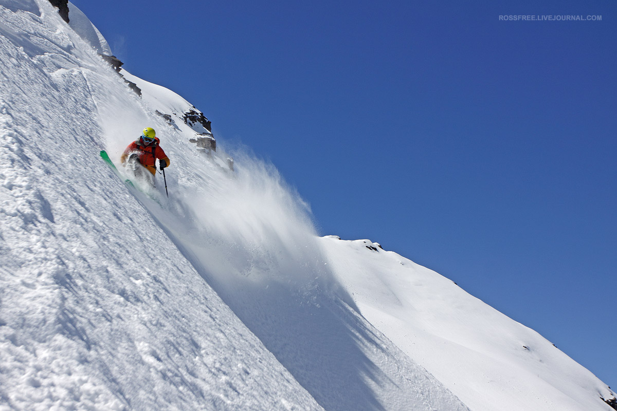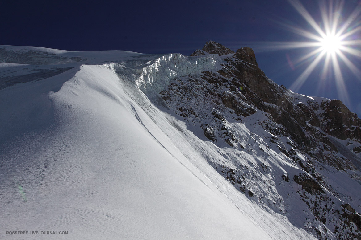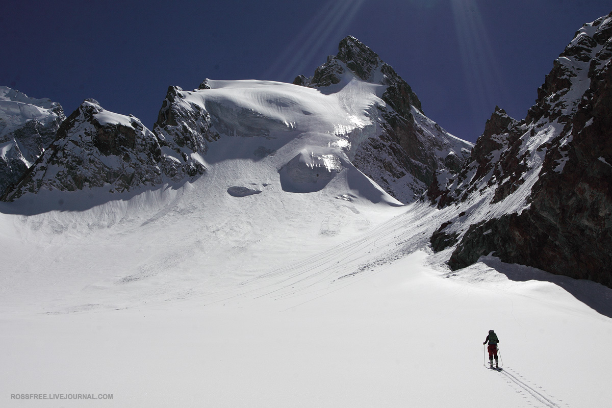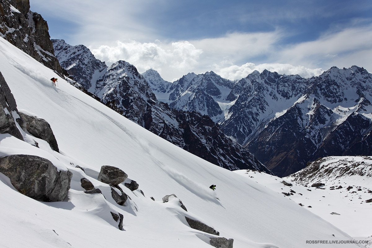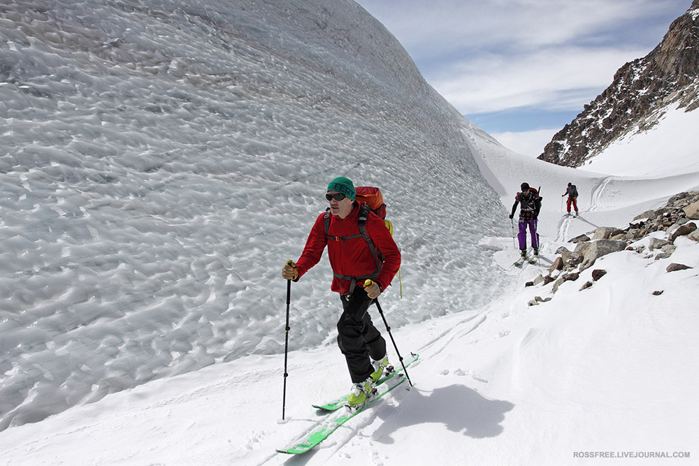 Поднимаемся, прижимаясь к теневым скалам. Пара тестов в снегу показали хорошую устойчивость, но вот камни прилететь очень даже могут. Несколько ледовых трещин угадываются под слоем снега, но проблем не вызывают. В верхней части склон становится круче, у перемычки до 50°, кошки пробивают снег до льда. Провешиваем веревку, кататься вниз не встегнувшись в лыжи – не наш метод. Наконец перемычка, можно попить чай и передохнуть. Набегают облака из долины, и я тороплю команду успеть спуститься пока есть хорошая видимость. А снег отличный, настоящий зимний пухляк на крутом склоне, стартую с перемычки и отпускаюсь в дуги по центру ледника, стараясь не забыть в экстазе расположение ледовых выходов и бергшрунда.