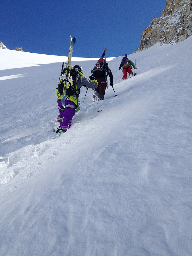 По утренней прохладе бодро дошли до хижины, набрав вертикальный километр. Там попили чай, переоделись в лыжников и поскитурили к пику Архимед. Солнце светит беспощадно, но наш склон северный, надеемся на хороший снег. Наш подъем на перемычку совпадает с классикой на Архимед.