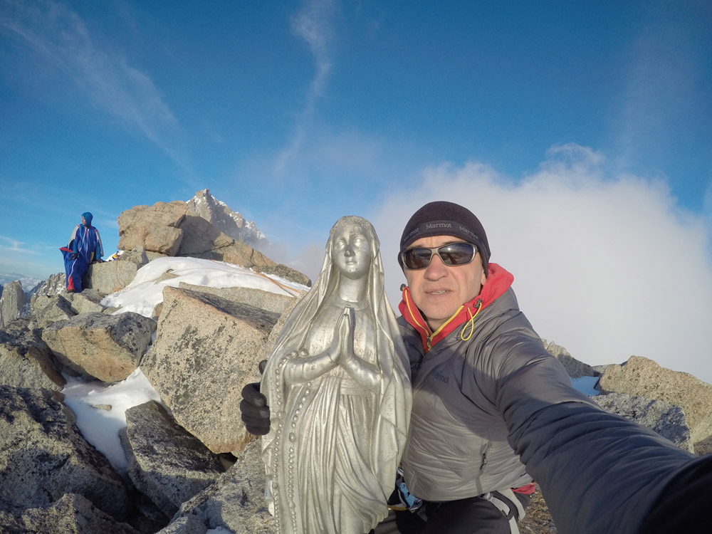 Дальнейшие наши пути «расходилетались». Валера облачился в свой шаманский костюм птицы, настроил антенки и стал распугивать крыльями непогоду и разгонять облака. Через 2 часа облака послушались, испугались и сделали специально для Валеры маленькое окошко для телепортации прямо в Шамони. Человек-птица улетел, а кто не мог летать, остался с 22-х килограммовой алюминиевой Мадонной один на один исполнять произвольную программу.