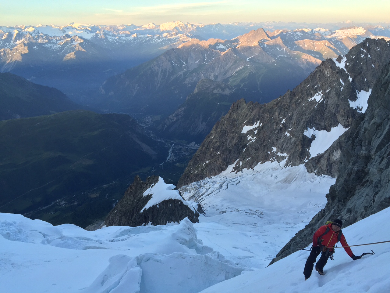 Акклиматизация, как и у многих здесь, проходит плавно и легко, с помощью канатки. Хоть немного можешь почувствовать себя наездником, а не конем. Поднимаешься по канатке с 1050 м на одну из игл Шамони Эгюй ди Миди, и ты на 3840 м. Маленькая прогулка по леднику, плотный ужин и полный сервис: бар, белый унитаз, туалетная бумага, теплый ночлег, мягкие одеяла на высоте 3652 м. Это хижина «Космик". Проснулся, завтрак, спустился вниз, трава, кафе, круассаны. Отдохнул, акклиматизировался и на своих двоих можешь скакать на любую местную гору.