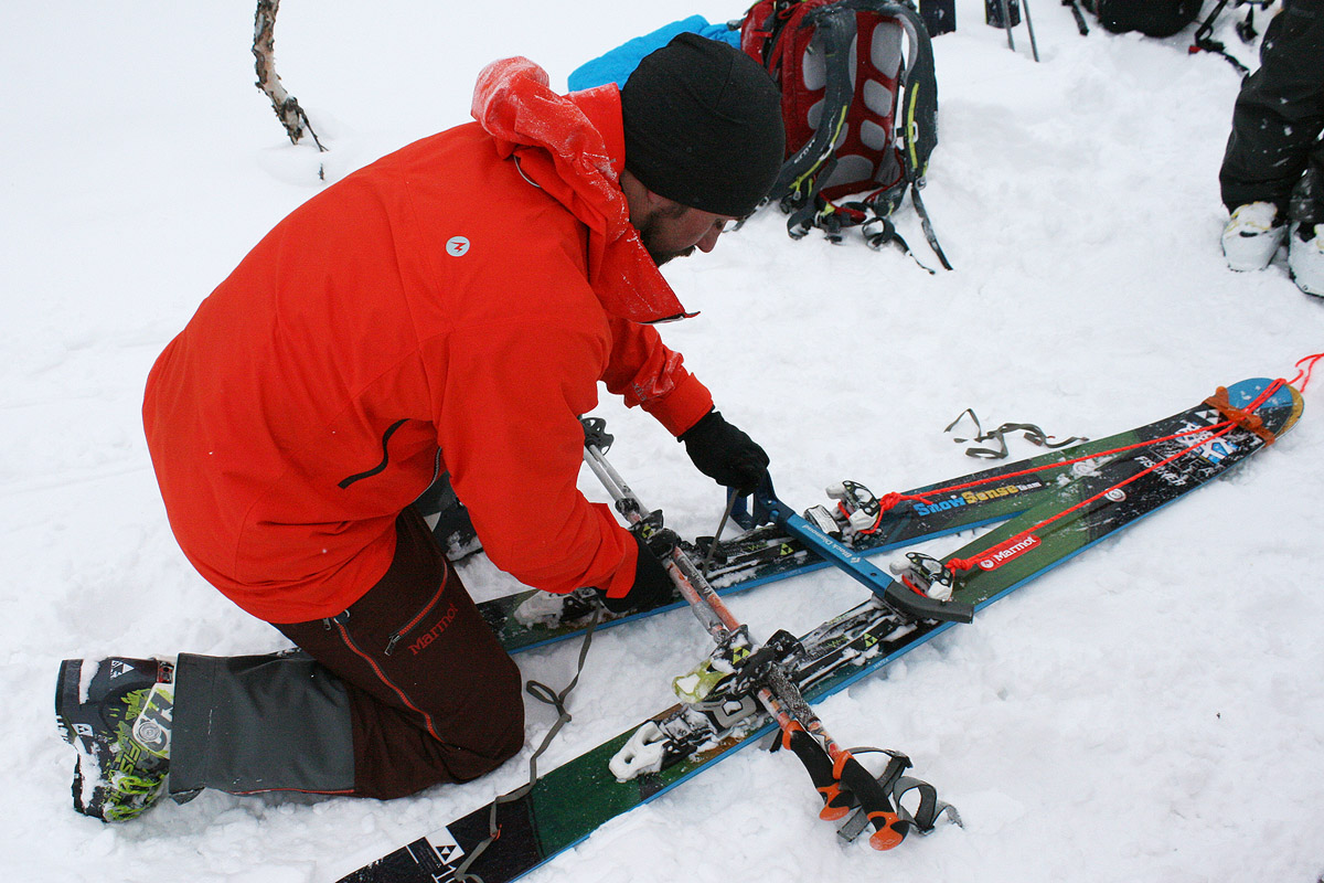 Из лыж нужно сформировать треугольную конструкцию. Для этого связываю концы лыж стрепом (стропа с различного рода пряжками или липучкой для фиксации лыж), под него продеваю репшнур, за которые потом буду тащить волокуши. Для того, чтобы не порезать стреп кантами, предварительно обматываю лыжи армированным скотчем. В районе пяток креплений фиксирую поперечину из черенка лопаты. Для подобных манипуляций в моем рюкзаке всегда армированный скотч, компактные и прочие стрепы, а также моток корда – тонкого и прочного шнура. Отличные стрепы Exped с металлическими пряжками-крючками купил в магазине Black Diamond, компактные и надежные. Корд – стропа от параплана.