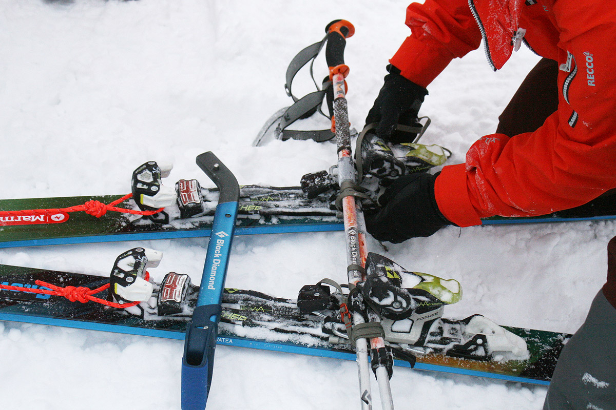 Закрепляю дополнительную поперечину из горнолыжных палок. Если скистопы на креплениях не фиксируются в закрытом положении, их нужно закрепить теми же стрепами в поднятом положении, чтобы не создавать лишнего сопротивления при транспортировке.