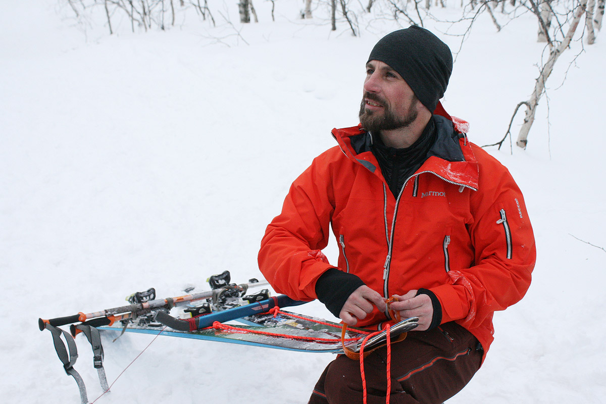 Во время своих скитур-программ я устраиваю практические занятия. Одно из них – изготовление волокуш из подручных средств для транспортировки пострадавшего в горах.
