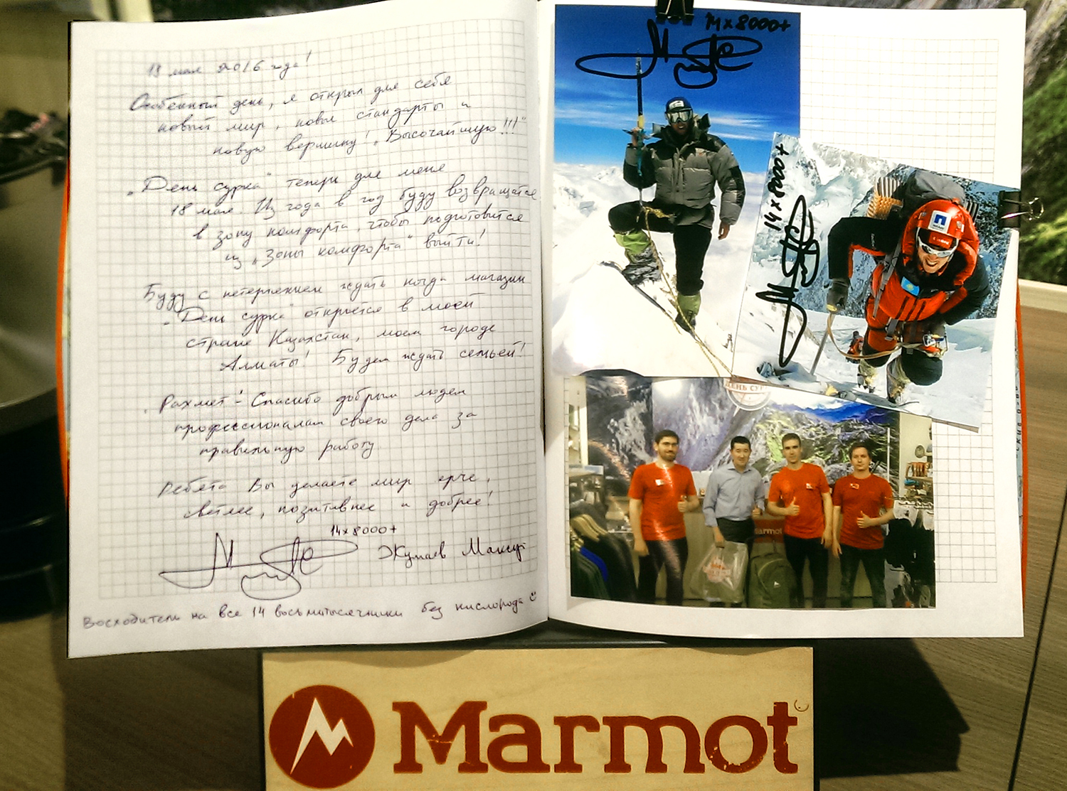 Максут с удовольствием переоблачился в одежду Marmot и написал несколько строк в гостевой книге магазина «День Сурка» в ТЦ Авиапарк.