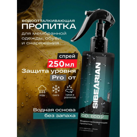 SIBEARIAN PRO GO ECO – это высокотехнологичная пропитка для восстановления водоотталкивающих свойств мембранных тканей и защиты спортивной одежды и снаряжения от воды и грязи. Уникальная формула на водной основе создает ультратонкое полимерное покрытие на каждом отдельном волокне ткани, защищая снаряжение от намокания и грязи.