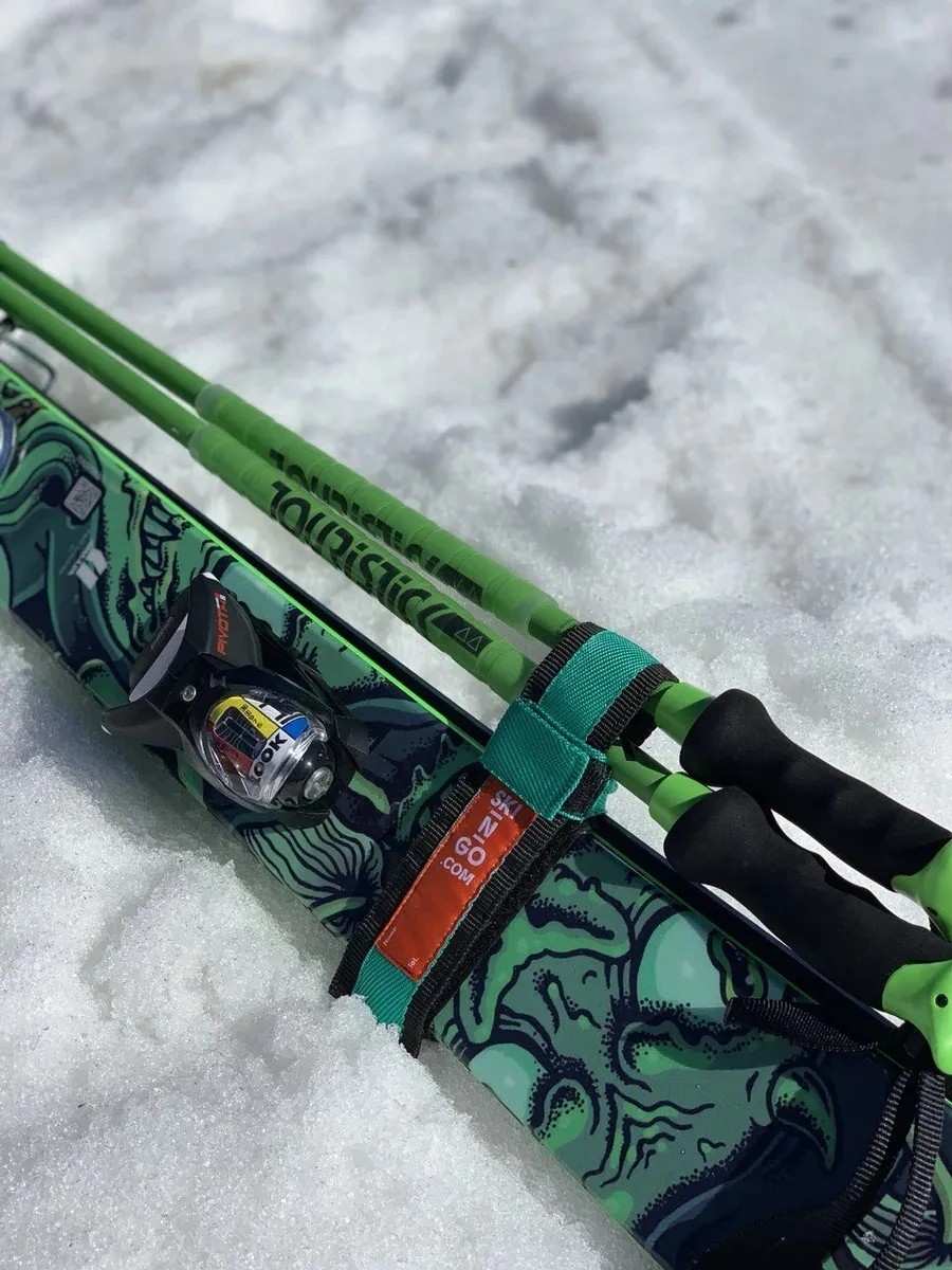 Связки для горных лыж SKI-N-GO предназначены для соединения лыж и палок в надежную конструкцию, которую можно нести одной рукой.