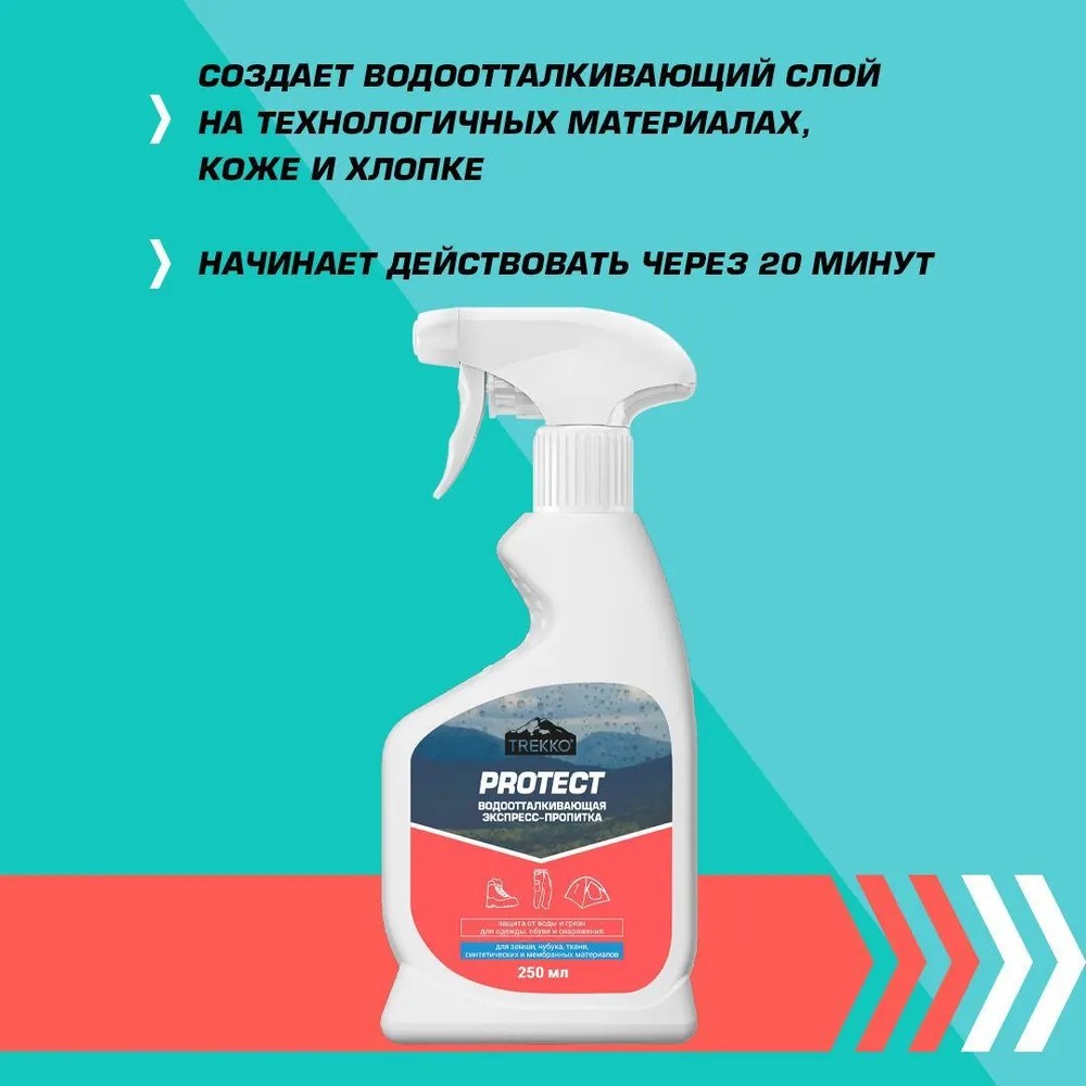Trekko Protect – это экспресс-спрей для защиты одежды, обуви и снаряжения от воды и грязи. Средство создаёт устойчивый гидрофобный слой всего за 15 минут. Подходит для натуральных и синтетических тканей, замши, нубука и мембран. Сохраняет дышащие свойства, цвет и текстуру материалов. Восстанавливает водоотталкивающие свойства вещам с заводской пропиткой.
