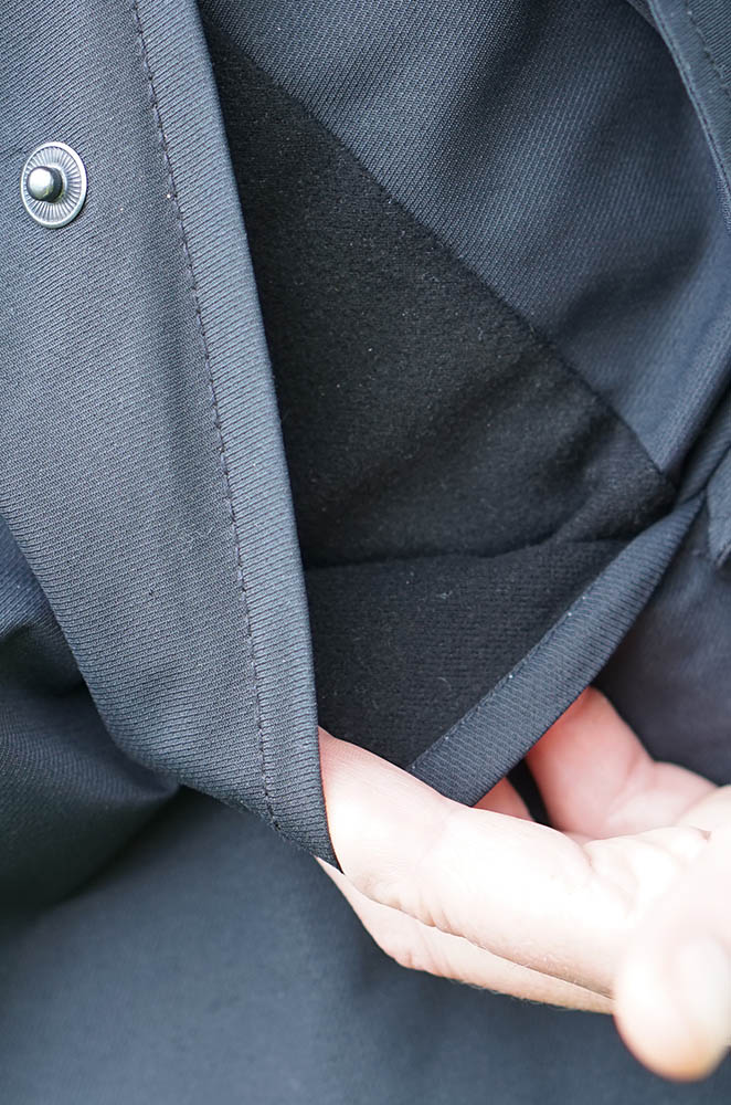 Если в прогулке по ненастному городу Вы присядете на мокрую скамейку, парапет или ступеньку лестницы, то с удовольствием обнаружите, что сидите не на подмокших джинсах, а на уютном теплом и сухом краешке пальто – его длина сзади позволяет это.