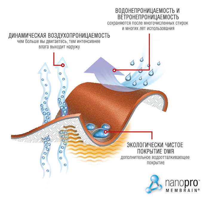 Материал Marmot NanoPro® Membrain® - новая технология, которая позволяет материалу не пропускать воду, но в то же время хорошо дышать, обеспечивая комфорт и надежную долгосрочную защиту от влаги. Специальная микропористая структура ткани обладает динамической воздухопроницаемостью, что позволяет отводить испаряющуюся влагу от кожи, не жертвуя водонепроницаемостью или защитой от порывов ветра.
