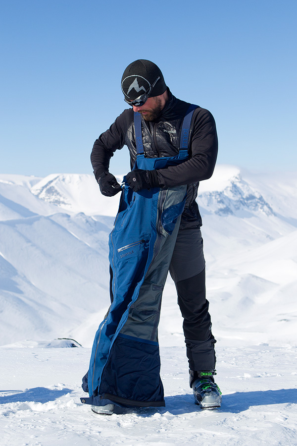 Молнии по бокам штанин позволяют снимать и одевать брюки прямо поверх обуви, что очень важно в горах. Если бы еще сделать разъёмные пряжки на подтяжках, то можно было бы переодеваться не снимая лыж. Боковые молнии можно также открывать сверху для вентиляции, верхний край брюк в таком случае будут удерживать двойные липучки.