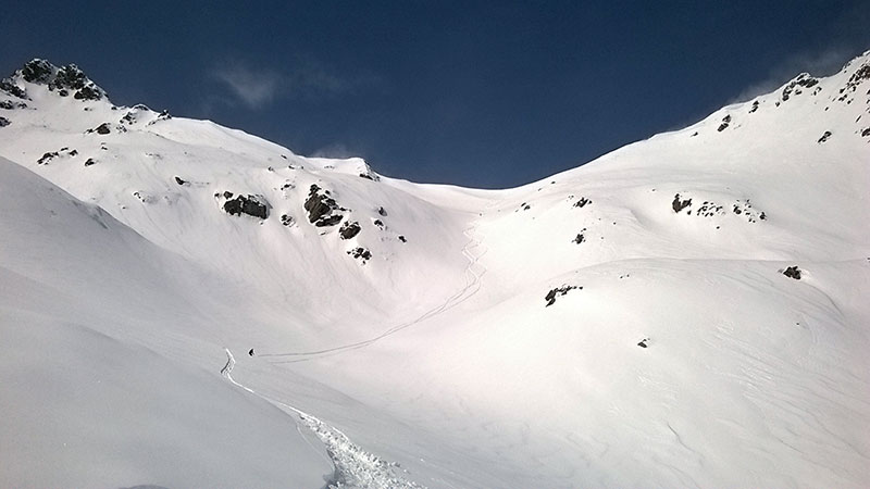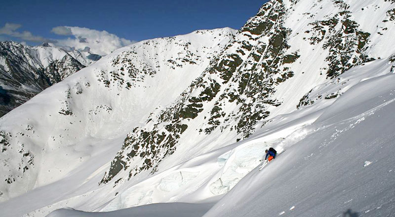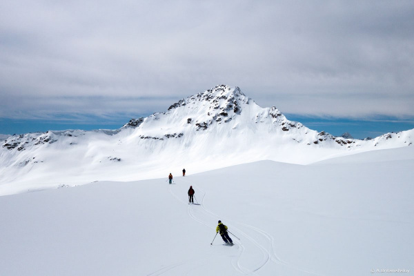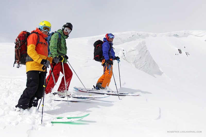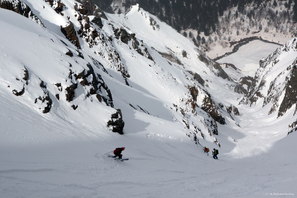 Зато спуск -1400 м перепада, Северный склон, сначала поля, затем кулуары - мечта фрирайдера!
