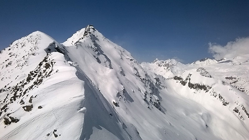 В этом году мы сходили практически самый дальний и технически сложный вариант на Чегете - так называемый Пирожок. Здесь помимо скитура нужно идти по скальному гребню, а в одном месте спускаться на веревке по скалам.