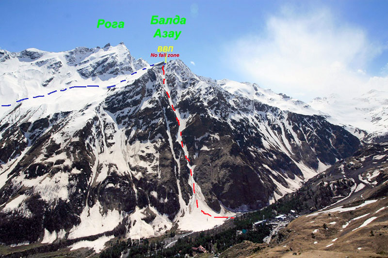 «Наш маршрут, красным спуск, синим подъем. Старт на 3000 м, затем спуск до 2700м, верх кулуара 3350м, низ - 2350м.»